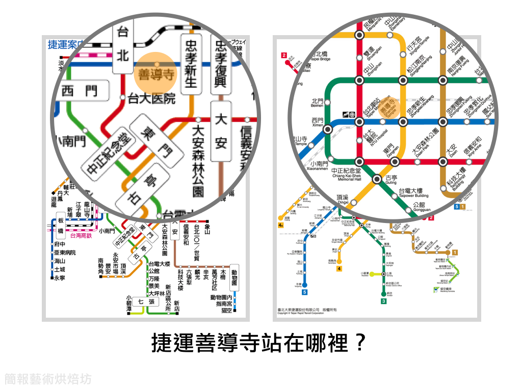 大家可以試著在同樣大小的地圖上找出捷運善導寺站的位置,