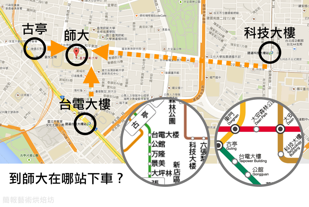雖然台灣版的捷運路線圖一樣經過簡化,但我們仍有辦法在路線圖中大約指出師大的位置。