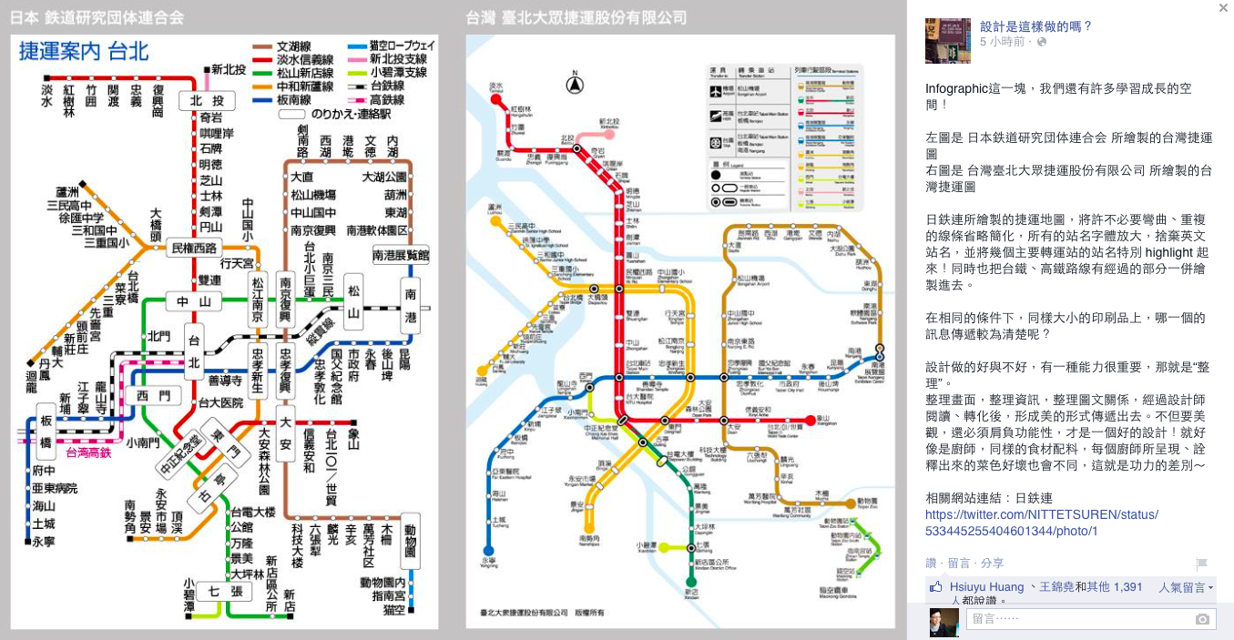 這篇文章想要傳達的不是兩種捷運路線圖何者較優的比較結果,而是提供一種看設計的方法。
