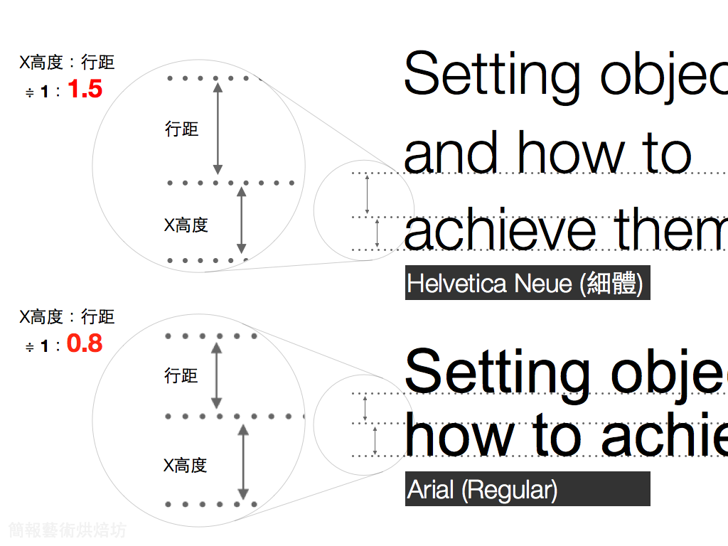 當行距相對於文字的(x)高度的比例太小時文字在視覺上容易被視為一個如圖片般的「實體」而在畫面中佔有份量。因此如果我們希望降低文字在投影片畫面中的份量,