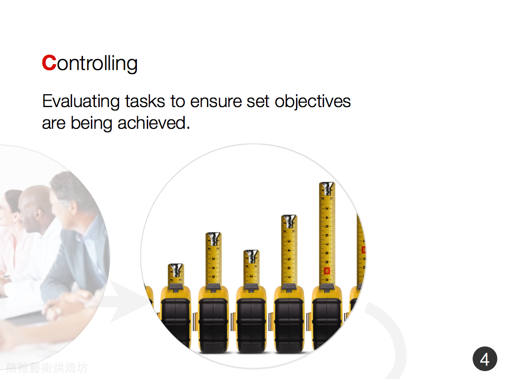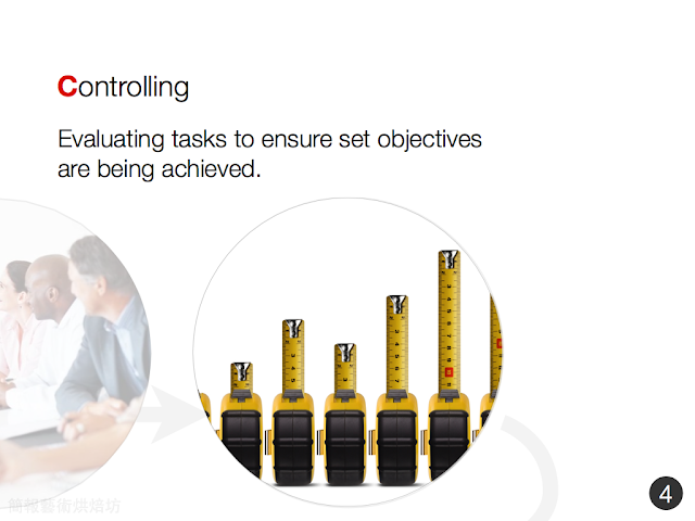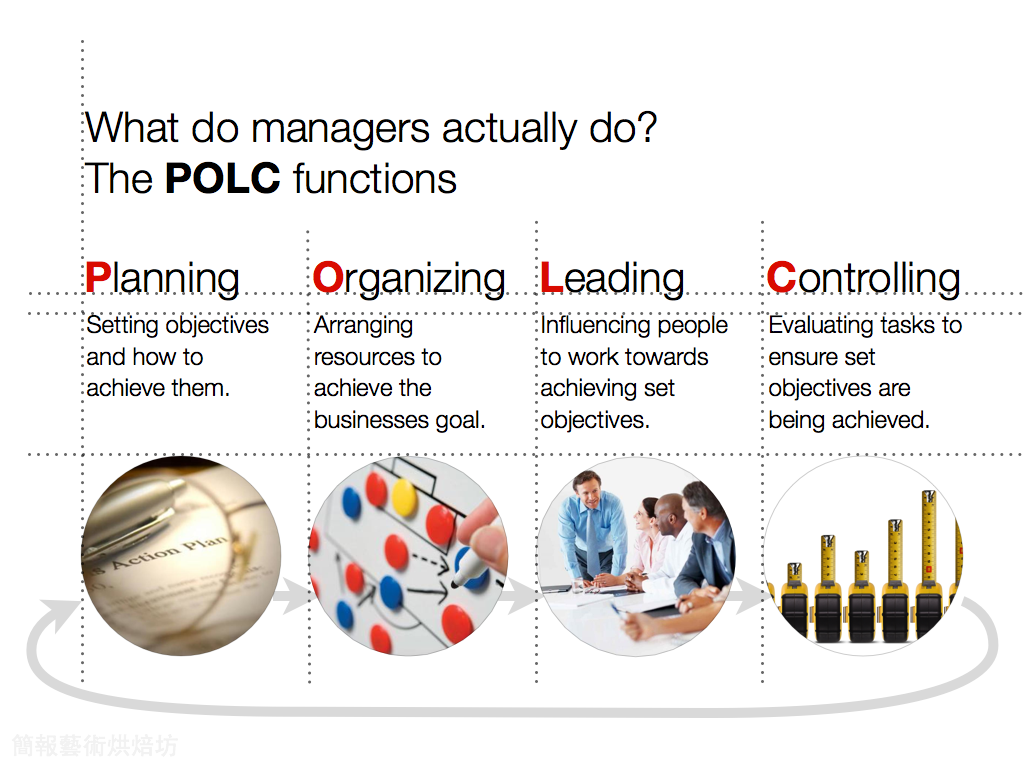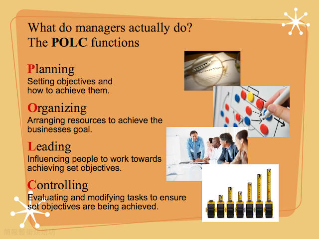 這張投影片所說的是管理學定義的經理人四大角色:計劃、組織、領導與控制