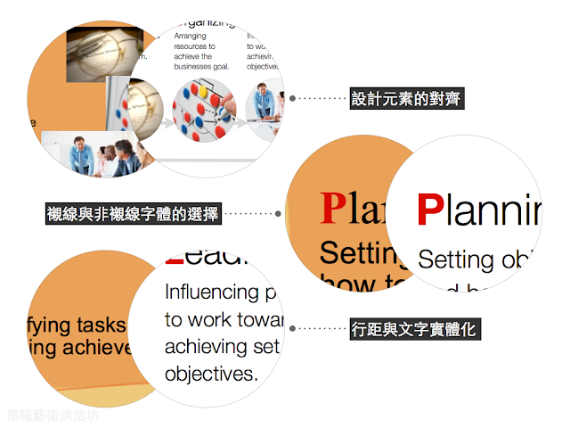 設計元素的對齊、襯線與非襯線字的選擇、行距與文字實體化