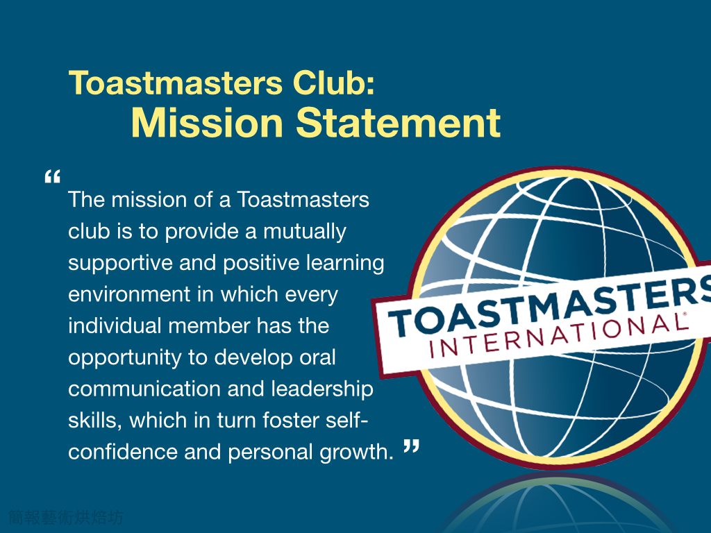 這張投影片的重點在於讓觀眾知道Toastmaters International的Mission Statement,