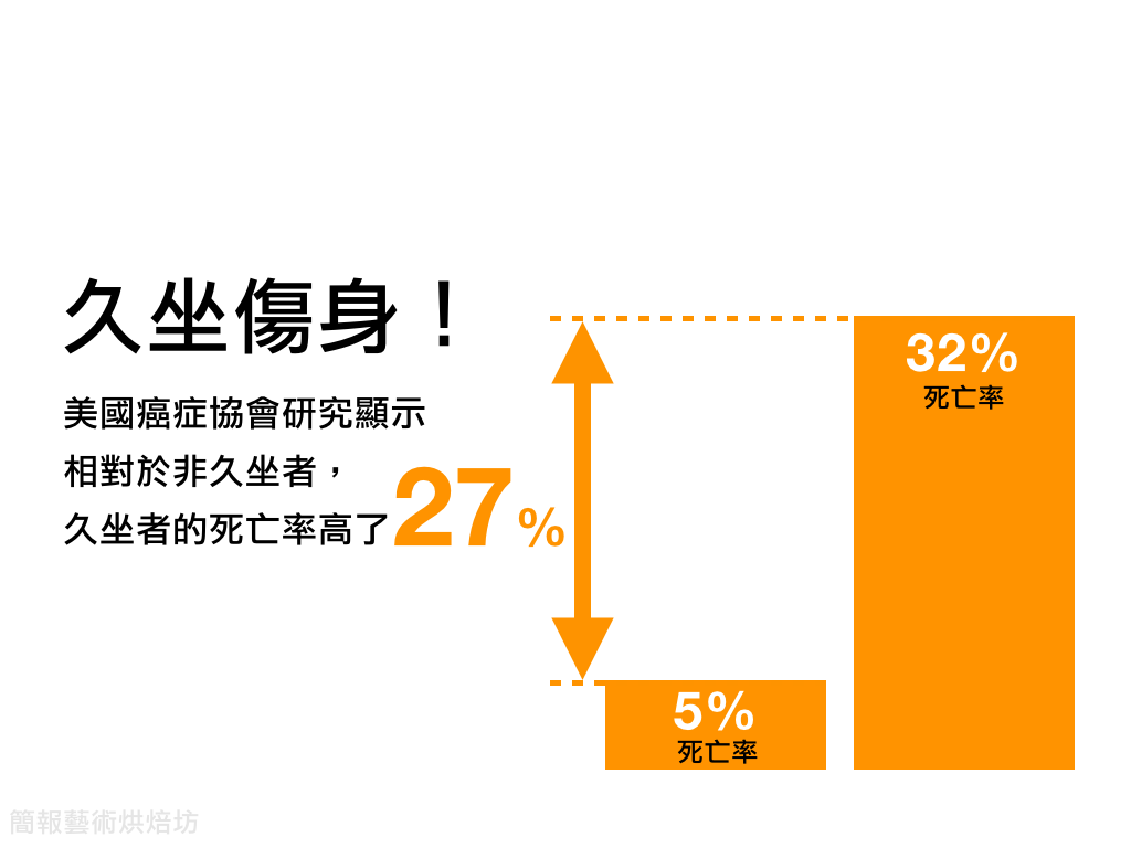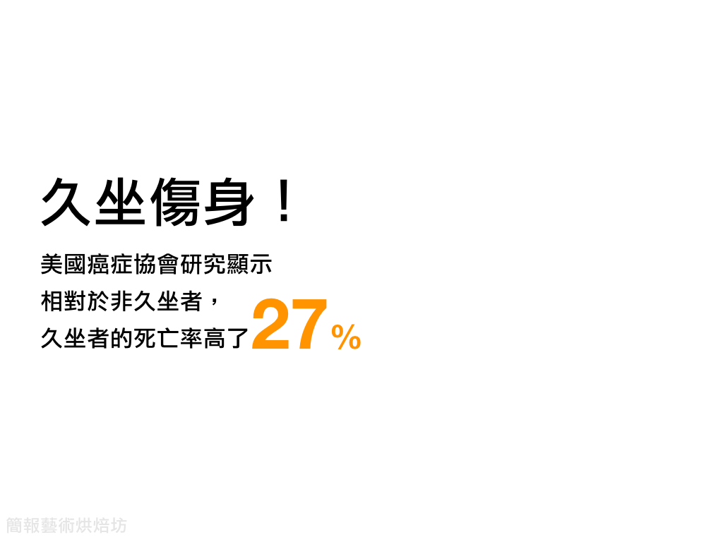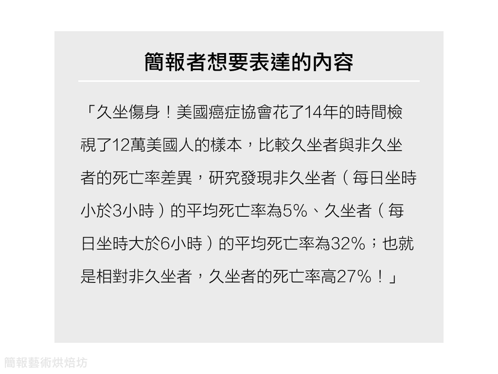 假設我們想要做一張簡報告訴觀眾久坐傷身的害處,