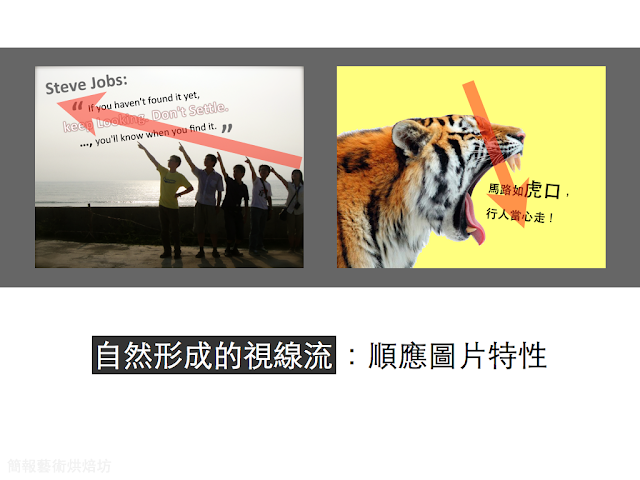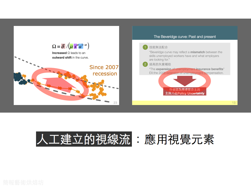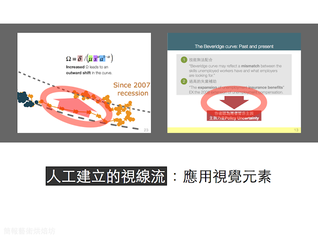 在簡報中善用一些視覺元素如箭頭、圓圈、方框等,可以增進視覺流的引導。