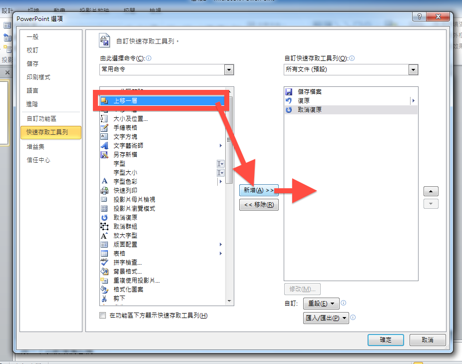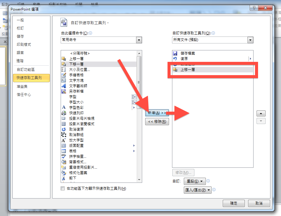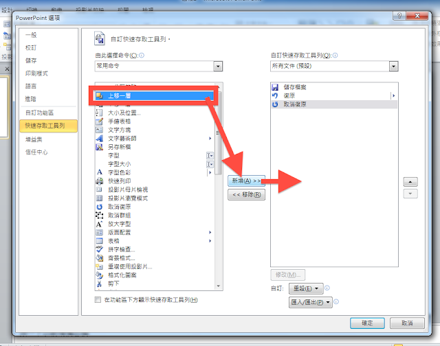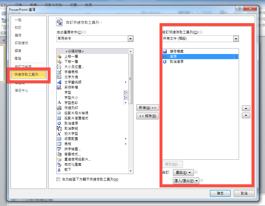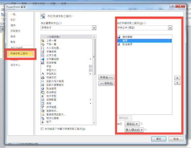 回到剛剛的「自訂快速存取工具列