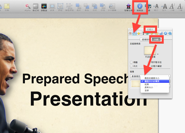 更改比例後的Keynote內的圖片會依照「原圖」比例放大直至觸及邊界,