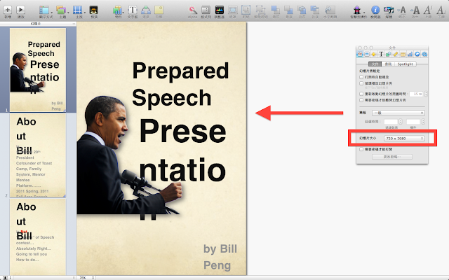 同時一般而言Keynote所使用的像素數 (1024×768)會比PowerPoint (720×540)大得多,