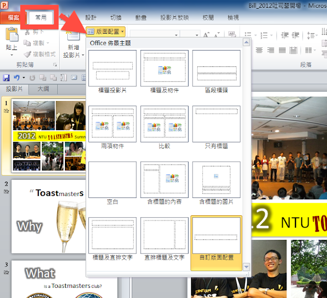 版面配置更改的是母片的部分,位於「常用」的選單內。