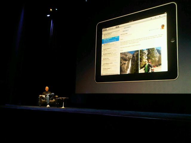 下圖是Steve Jobs第一次展示iPad功能時的照片,