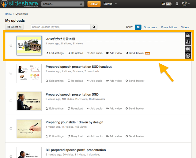 上傳好以後,你的簡報就會出現在”My uploads”之中。